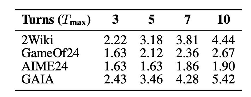 对于相同的数据集下的不同难度任务:譬如说多跳搜索(Multihop Search),智能体任务中的密集长链推理任务,AgentFlow在经过 FlowGRPO训练后能够随着最大限制推理步数的上升稳步提升性能,同时又不会大幅提升平均推理步数——这表示对于长难任务会增加有效的推理步数来提升正确率,而不会一味地所有任务都随着最大轮数限制而延长推理步数。