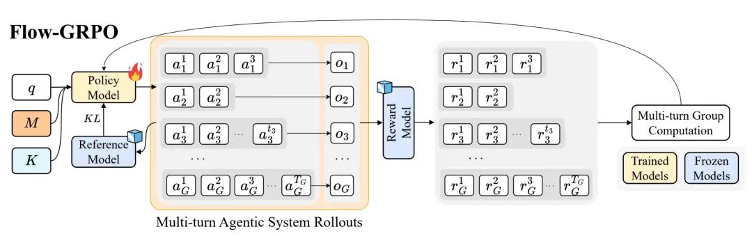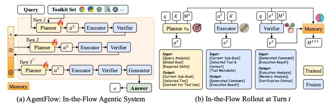 它由规划器、执行器、验证器、生成器四个专业智能体组成的团队通过共享内存进行协作,利用新方法Flow-GRPO,在系统内部直接对其规划器智能体进行实时优化。