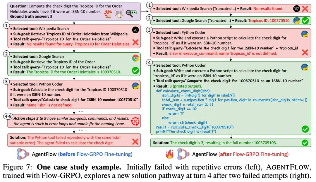 此外,尽管AgentFlow的推理流本身能够利用其强大的任务分解能力带来显著性能提升,但仍可能出现循环错误或卡顿问题。通过在真实环境中的训练,智能体系统展现出快速修正错误的工具调用、更精细的子任务规划,以及全局任务解决性能的提升。