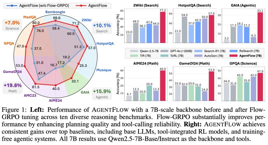 以Qwen-2.5-7B-Instruct为基座模型的AgentFlow在10个基准测试中表现突出: