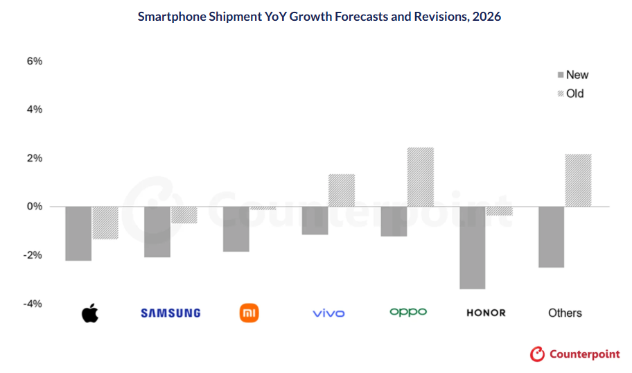 从具体的品牌厂商表现来看,在2026年的智能手机市场,前六大智能手机厂商分别为苹果(份额为19%)、三星(19%)、小米(14%)、vivo(9%)、OPPO(8%)、HONOR(6%),但是他们的出货量均出现了同比下滑,下滑幅度分别为2.2%、2.1%、1.8%、1.2%、1.2%、3.4%。