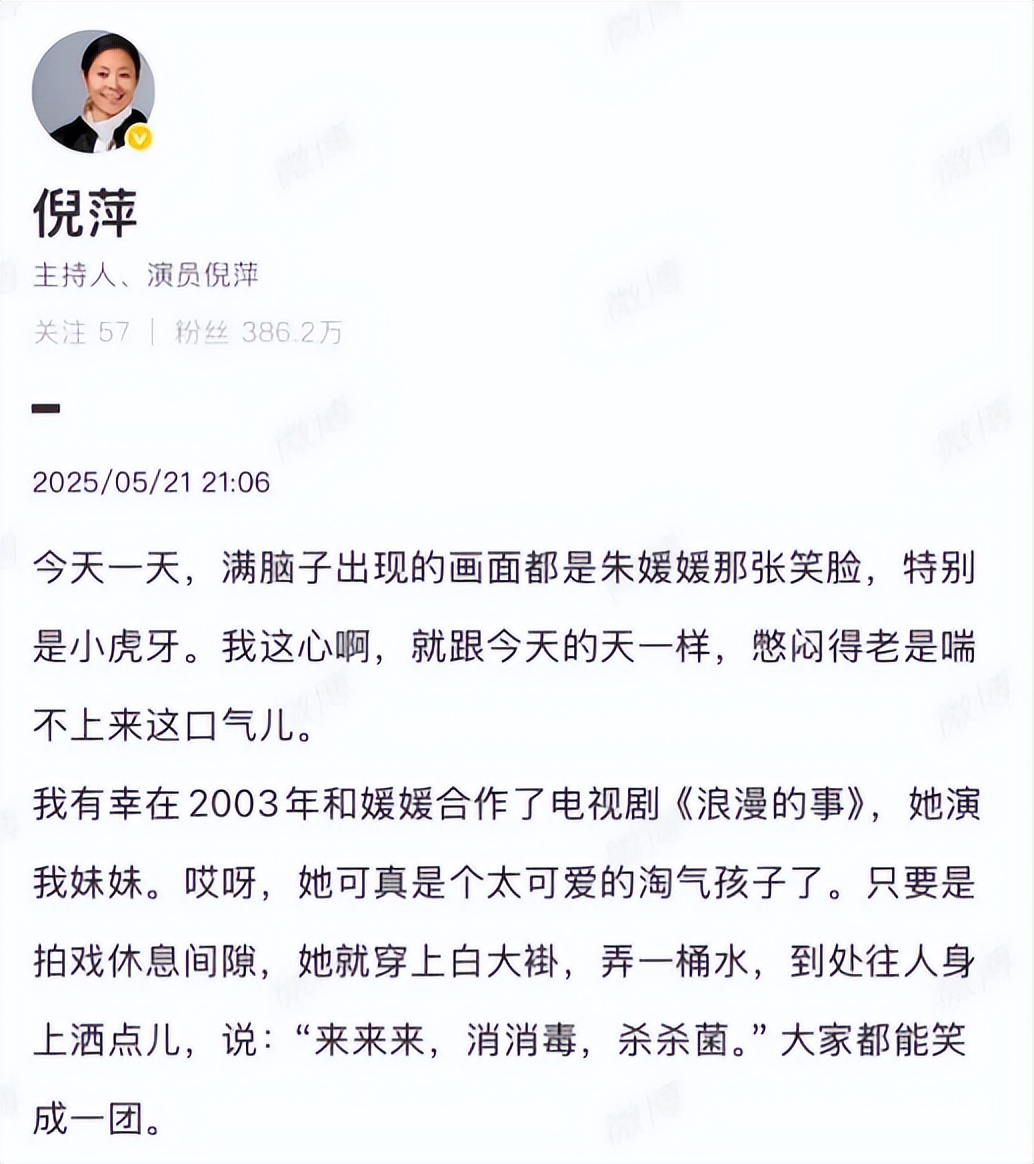 倪萍那篇千字文章看似在怀念朱媛媛,实则把娱乐圈半壁江山都给diss了。她吐槽年轻演员“病历都看不懂就敢乱演”,还调侃某些明星“打个点滴都要炒作成热点”。这哪是悼念,分明是开了一个行业批判大会。