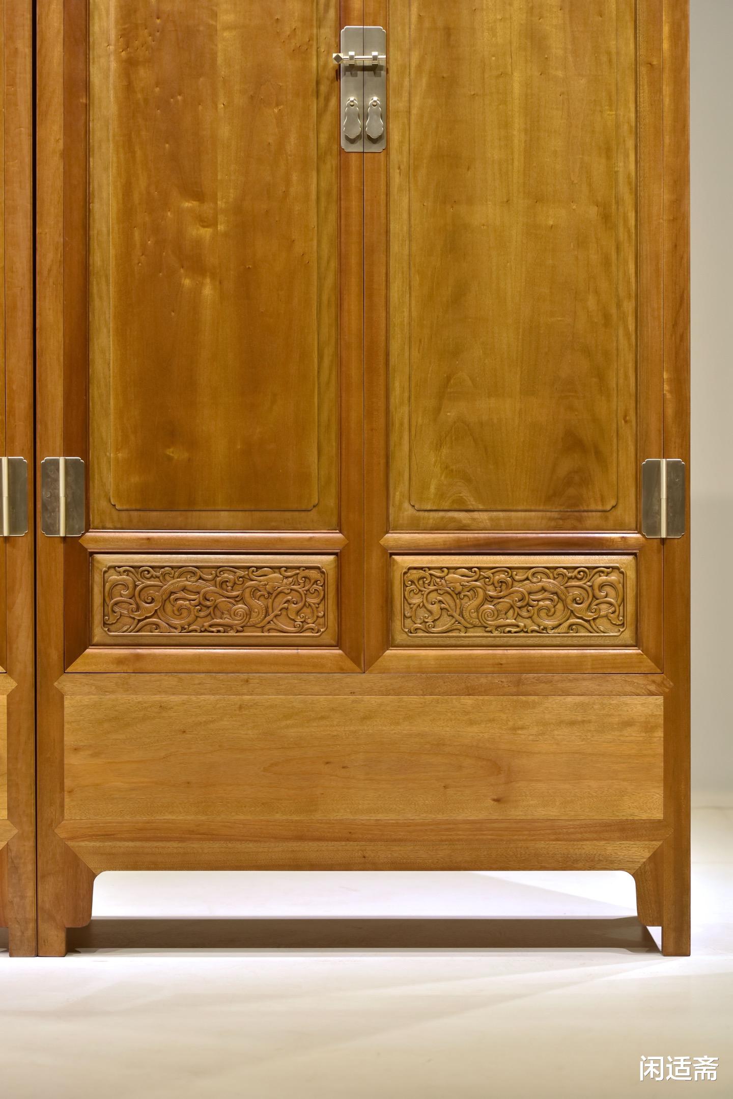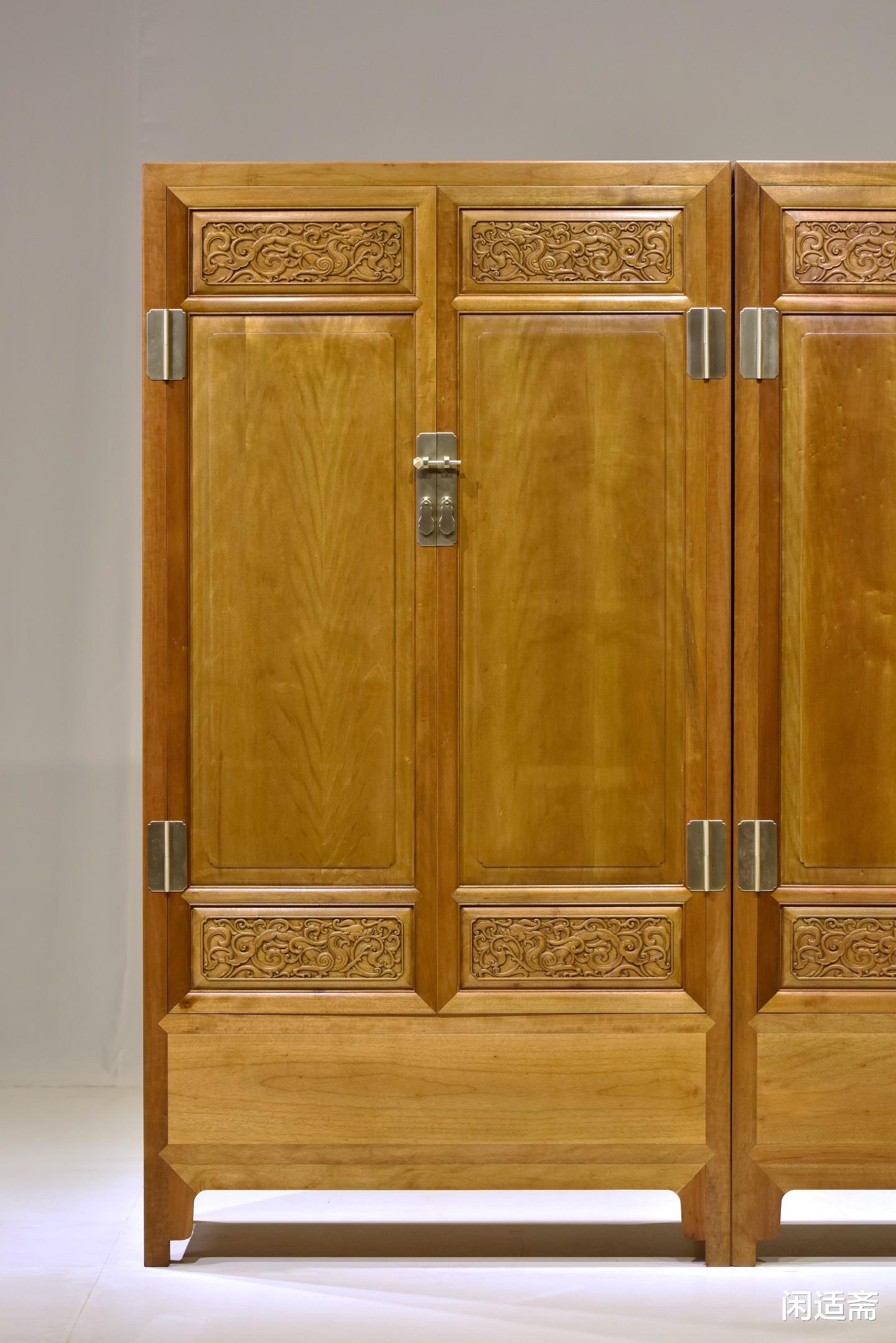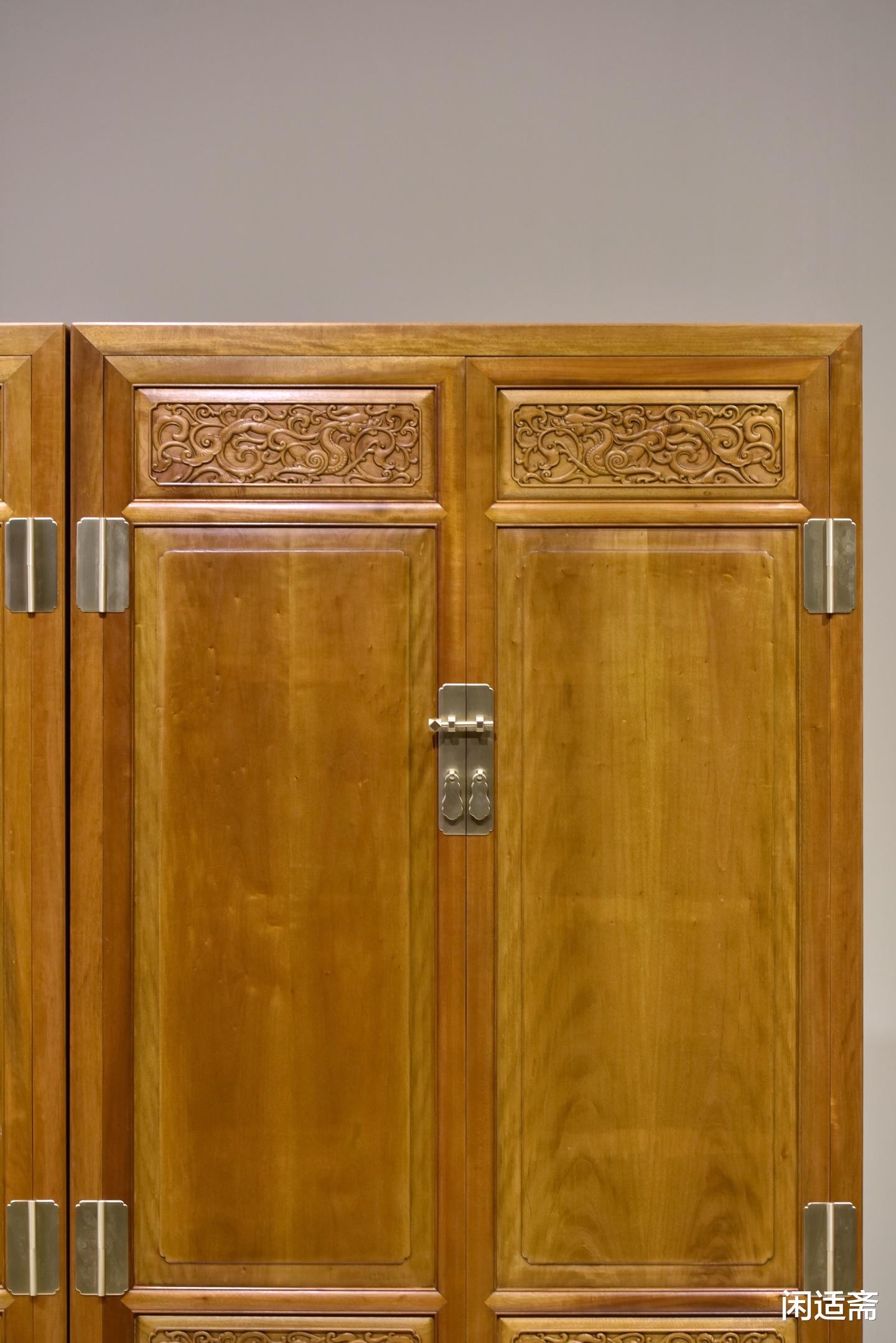 装饰上以螭龙纹为核心元素,尽显传统吉祥美学。匠人以精湛的手工雕刻工艺,将螭龙纹巧妙点缀于柜门之上,螭龙形态各异,盘旋缠绕,姿态灵动逼真,栩栩如生。雕刻线条流畅遒劲,深浅有度,层次分明,每一处细节都刻画得细腻入微,既展现了匠人高超的雕刻技艺,又借螭龙“吉祥瑞庆、守护安康”的美好寓意,为器物注入深厚的文化内涵。整器搭配素净的柜身,既避免了雕饰的繁复冗余,又让吉祥意蕴贯穿全器,尽显雅致格调。