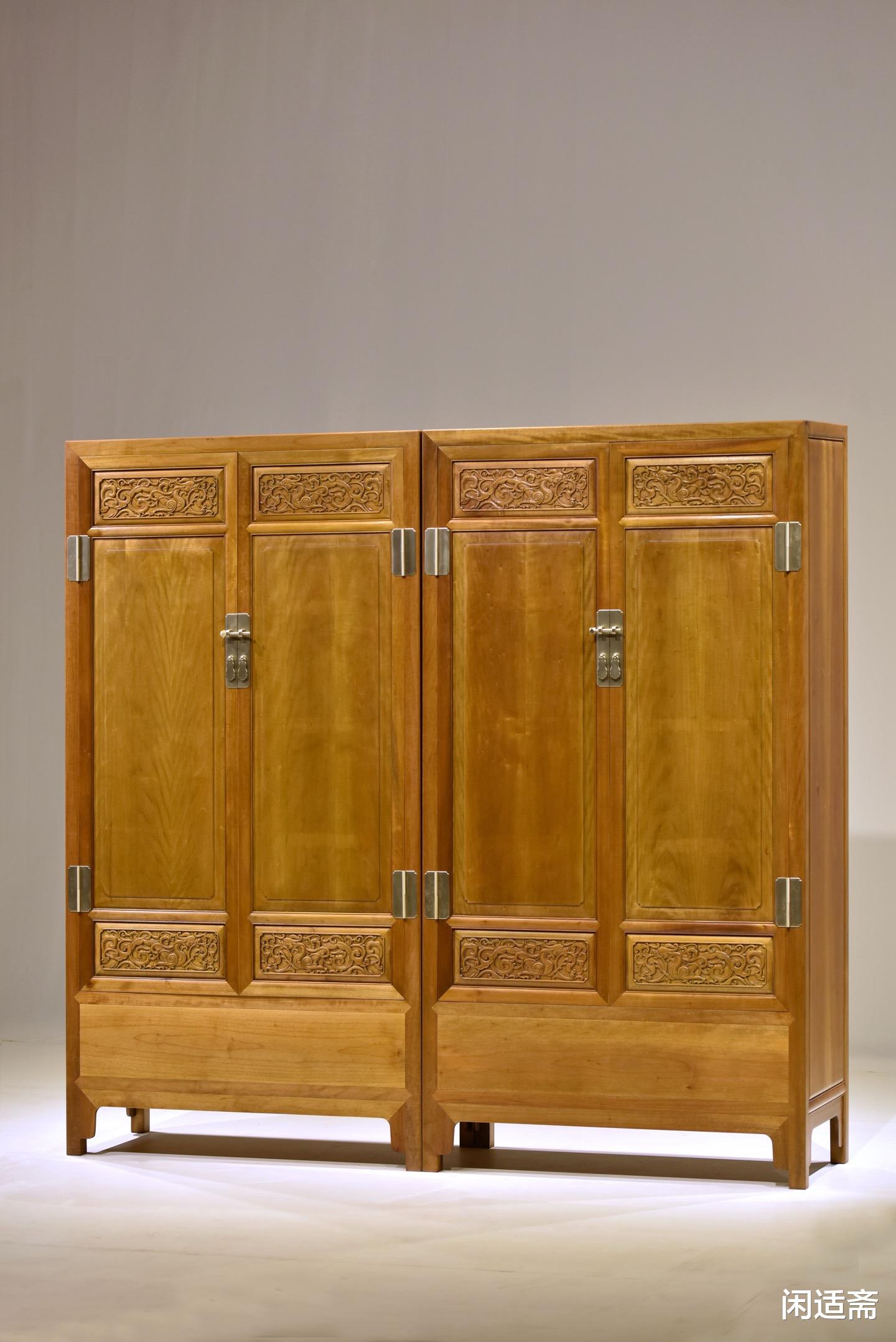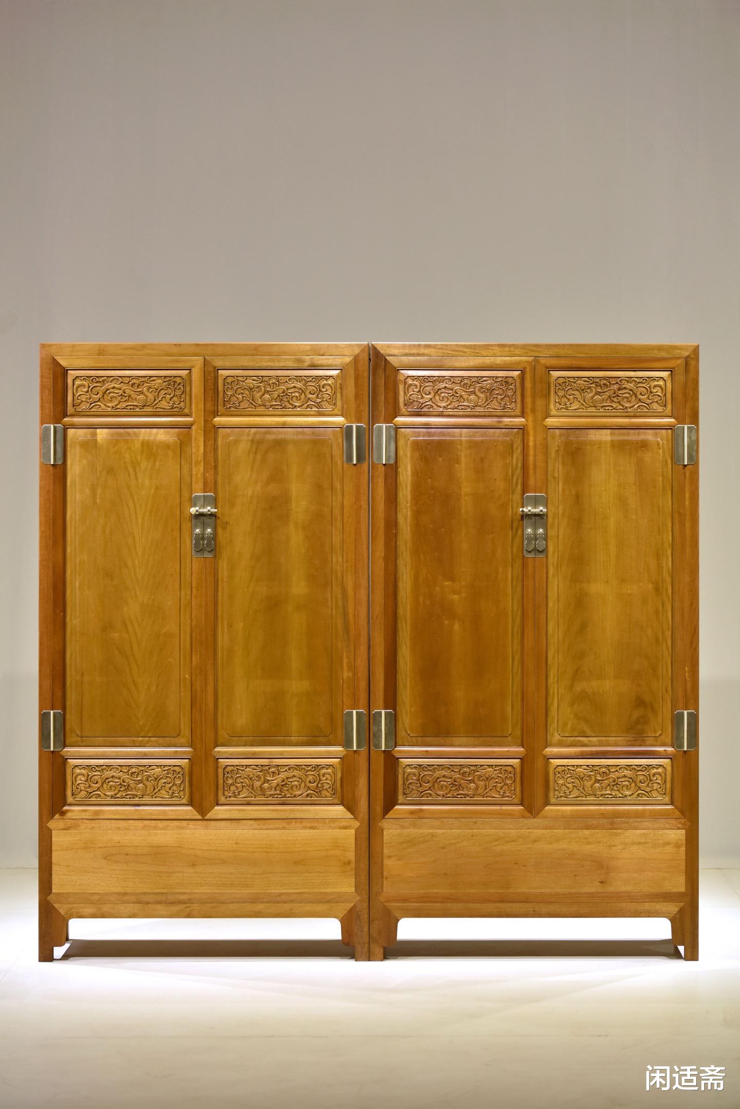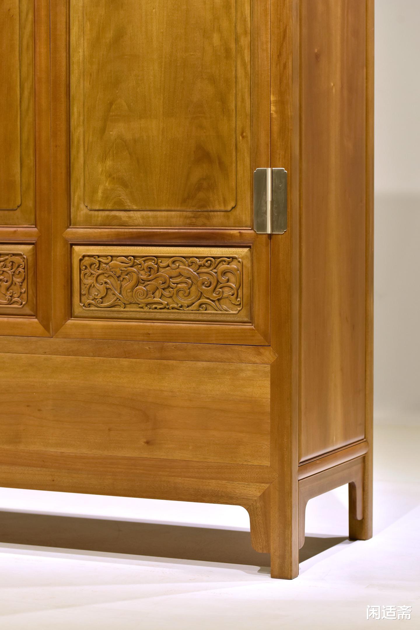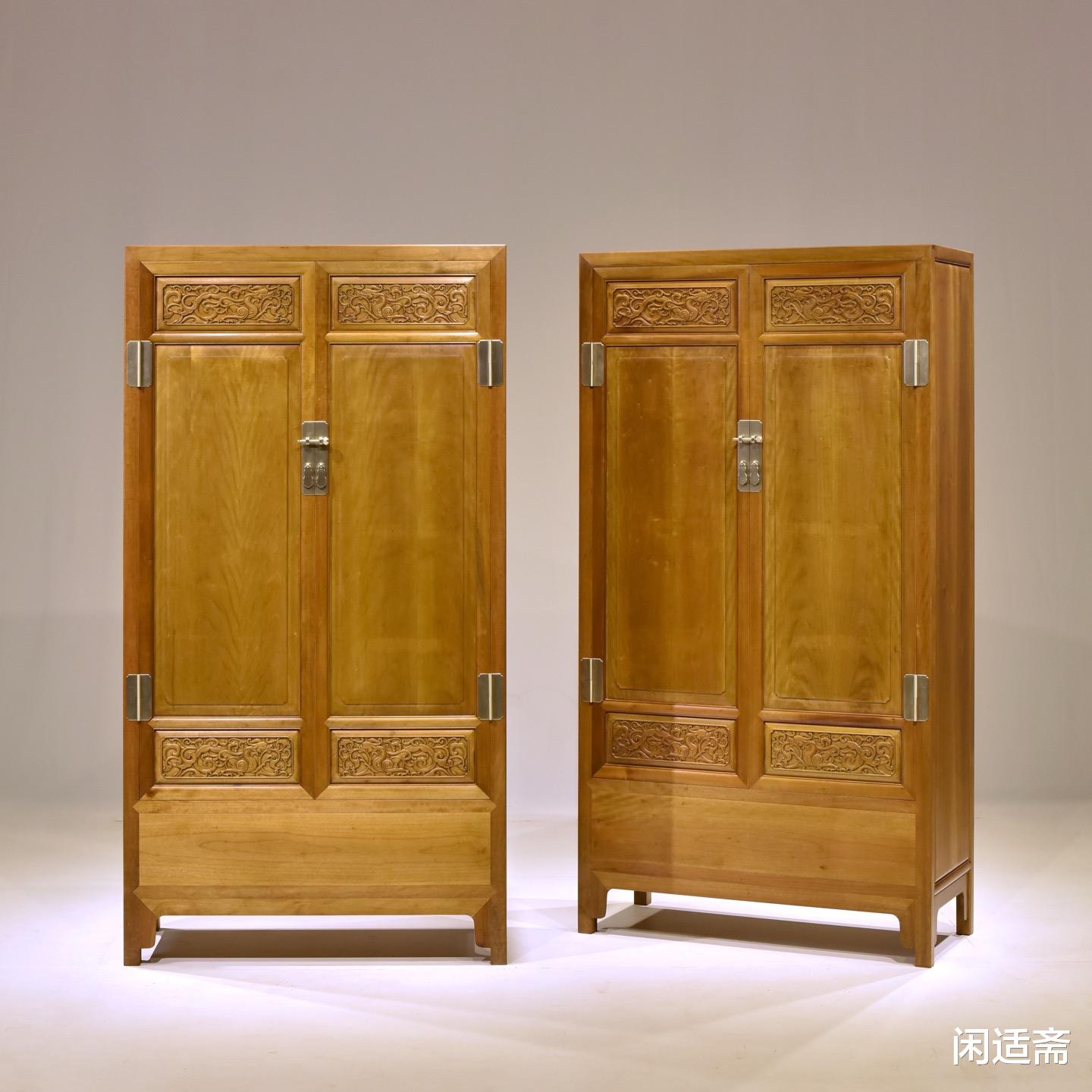 装饰上以螭龙纹为核心元素,尽显传统吉祥美学。匠人以精湛的手工雕刻工艺,将螭龙纹巧妙点缀于柜门之上,螭龙形态各异,盘旋缠绕,姿态灵动逼真,栩栩如生。雕刻线条流畅遒劲,深浅有度,层次分明,每一处细节都刻画得细腻入微,既展现了匠人高超的雕刻技艺,又借螭龙“吉祥瑞庆、守护安康”的美好寓意,为器物注入深厚的文化内涵。整器搭配素净的柜身,既避免了雕饰的繁复冗余,又让吉祥意蕴贯穿全器,尽显雅致格调。