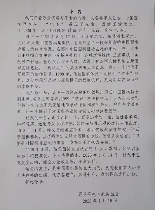 黑白世界的经纬间,一盏明灯悄然熄灭。1月14日晚,中国围棋协会名誉主席、“棋圣”聂卫平九段在北京病逝,享年73岁。这则消息让无数棋迷扼腕叹息,也让中国围棋界失去了一位标志性的传奇人物。送别聂老,不仅是送别一位顶尖棋手,更是送别一个用棋子点燃民族激情、用一生践行棋道初心的时代符号。