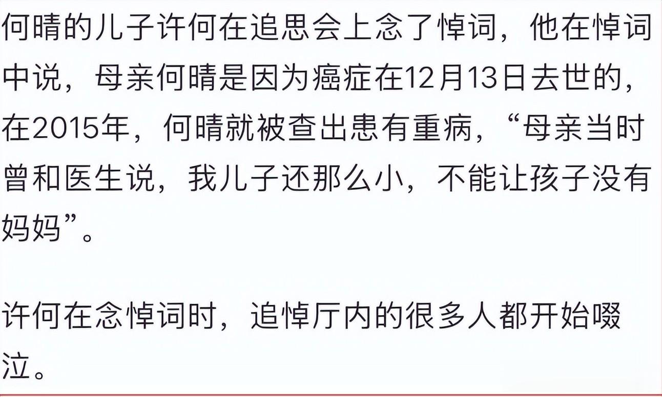 近日,何晴的儿子许何在社交媒体上罕见分享了母亲临终前的场景,字里行间流露出深深的思念与不舍。