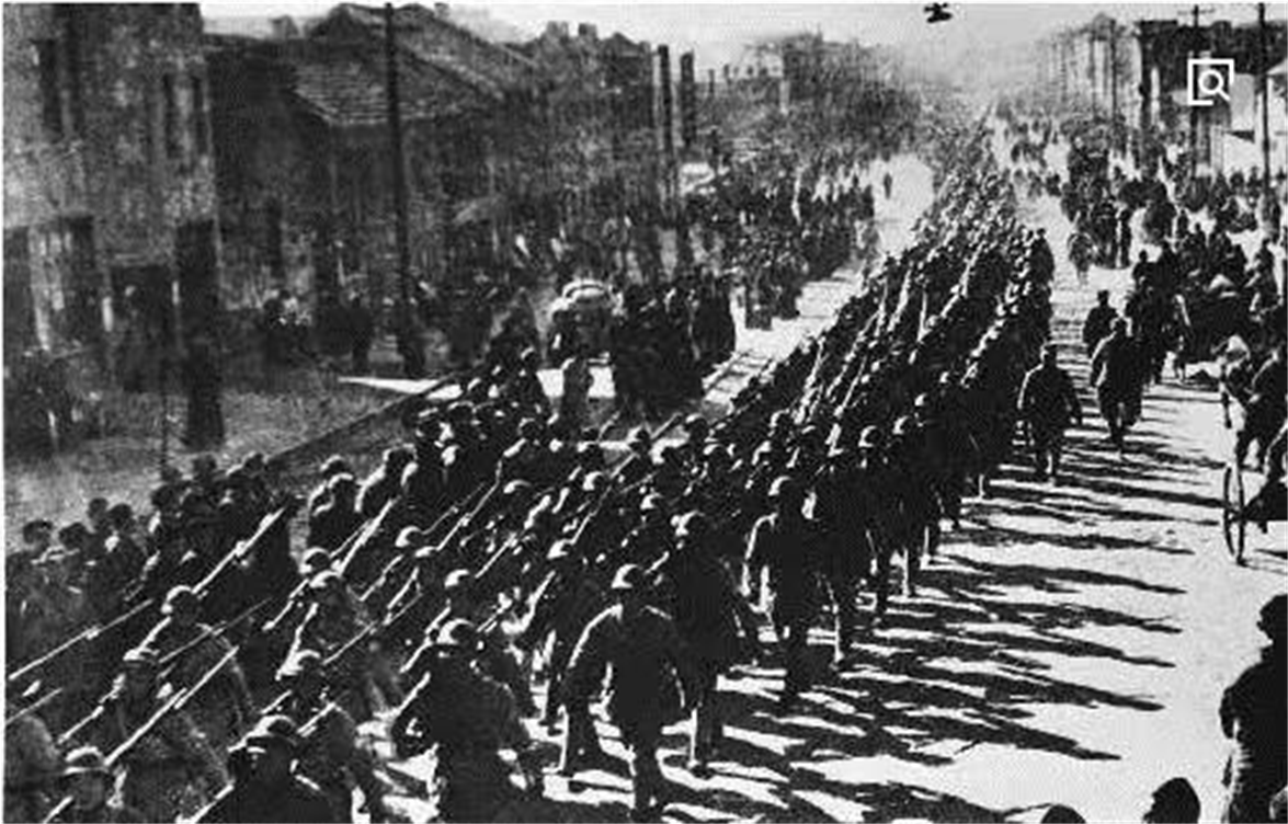 第一面红旗在雾气里出现,猎猎作响,解放军排成整齐队列,踏着碎石走进来。