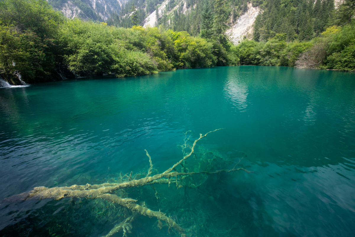 九寨沟湖水的奇幻色彩首先归功于湖底独特的钙华沉积层。这些由碳酸钙结晶形成的阶梯式结构,就像天然的光学滤镜——多层水膜增强光线折射,高纯度钙华晶体产生镜面反射,使得阳光中的蓝绿光波段被选择性强化。对比黄龙五彩池可知,这种钙化地形能将普通水体的色彩浓度提升3-5倍。地质剖面图显示,九寨沟湖床的钙华层厚度可达12米,是形成"光学增强效应"的关键。