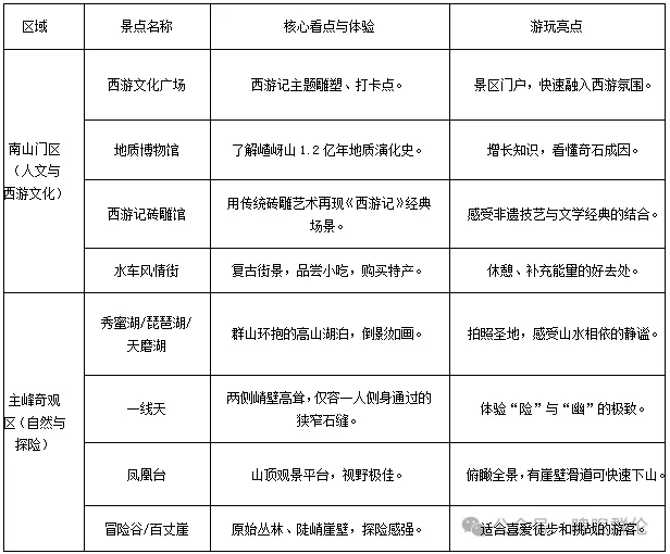 一日精华游:建议早上抵达,从南山门进入,游览西游文化广场、地质博物馆。乘坐观光车或“魔毯”上山,重点观赏“天下第一石猴”等奇石,徒步体验“一线天”,登上“凤凰台”俯瞰全景。下午可体验“天空漂流”或“崖壁滑道”下山,最后在水车风情街享用晚餐。