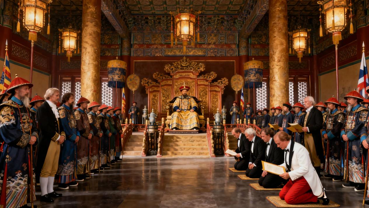 乾隆五十八年,英国派出马戛尔尼使团访华,带来了庞大的外交礼物清单:包括一艘还原了 110 门重炮的英国战舰模型、蒸汽机模型、连发步枪、望远镜等先进科技产品,目的是希望与清朝通商,并让清朝了解西方的发展。可清朝官员对此毫无兴趣,甚至得出了 “英国佬走路步履僵硬,膝盖不易弯曲,伏地难起,战场不堪一击” 的荒谬结论。大将军福康安受邀参观英国的枪炮演练,竟然不屑地说:“看亦可,不看亦可,火器操练,没什么稀罕的。” 乾隆皇帝更是对使团带来的礼物嗤之以鼻,只关心使团是否行三跪九叩大礼。唯一让他觉得新奇的,是使团里一个 12 岁就会说流利汉语的男孩乔治・斯当东,乾隆允许他在宝座下玩耍,以示 “天朝上国” 的恩宠。