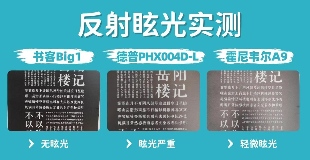 书客Big1在实测中几乎无眩光干扰。八重光学矩阵配合全域防眩光4.0技术,使光线以漫射方式输出,书页反光极少,直视发光面也不刺眼。