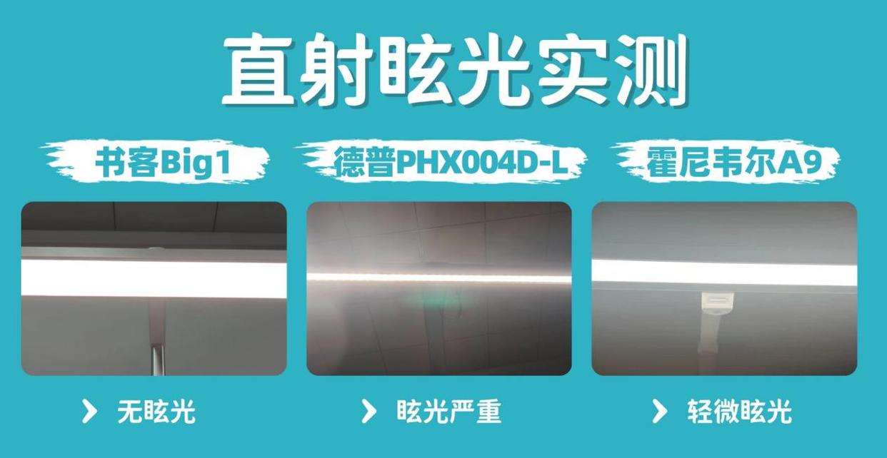 实测方法说明:在正常坐姿下,观察光面书本反射情况,并短时间直视发光面,评估刺眼感。