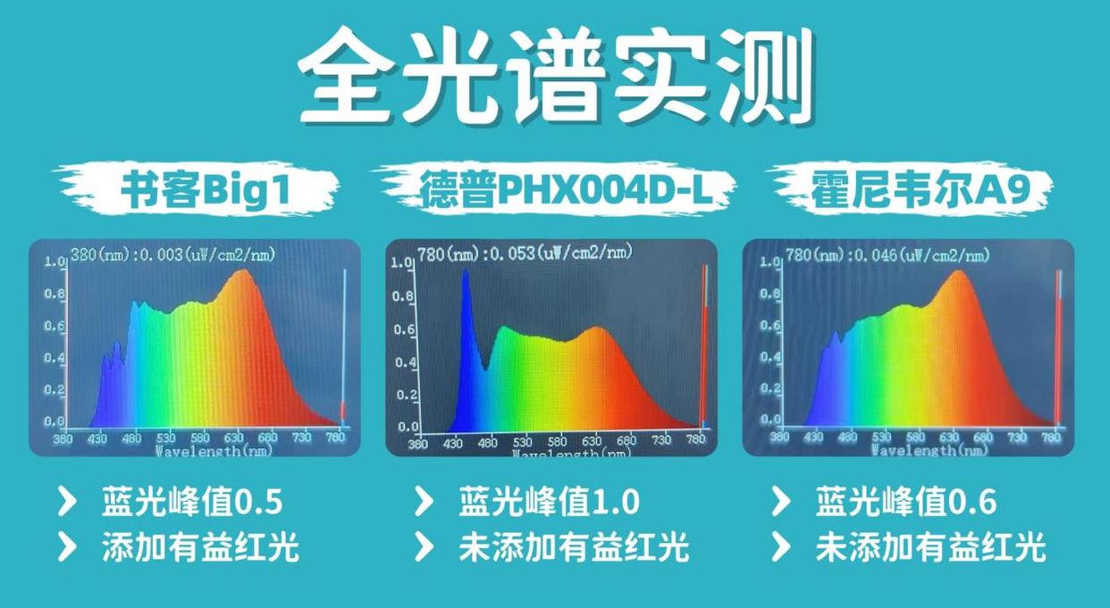 书客Big1的蓝光峰值仅为0.5,在三款中最低,同时具备明显红光增益区间。这得益于其RRT3.0红光养眼技术,实现了“科学控蓝”与“主动补红”的闭环,整体光谱曲线平滑连续,更接近自然光分布,长期使用对视觉刺激更小。