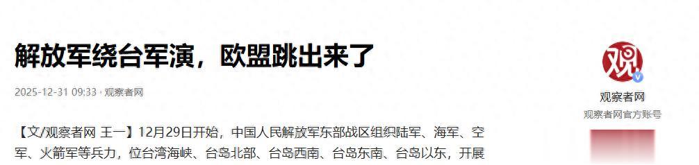 根据《观察者网》报道,在当地时间2025年12月30日,欧盟对外行动署发言人安希佩尔声称,“欧盟对维护台湾海峡现状有直接利益,我们反对任何单方面改变现状的行动,尤其是通过武力或胁迫”,呼吁“保持克制”。