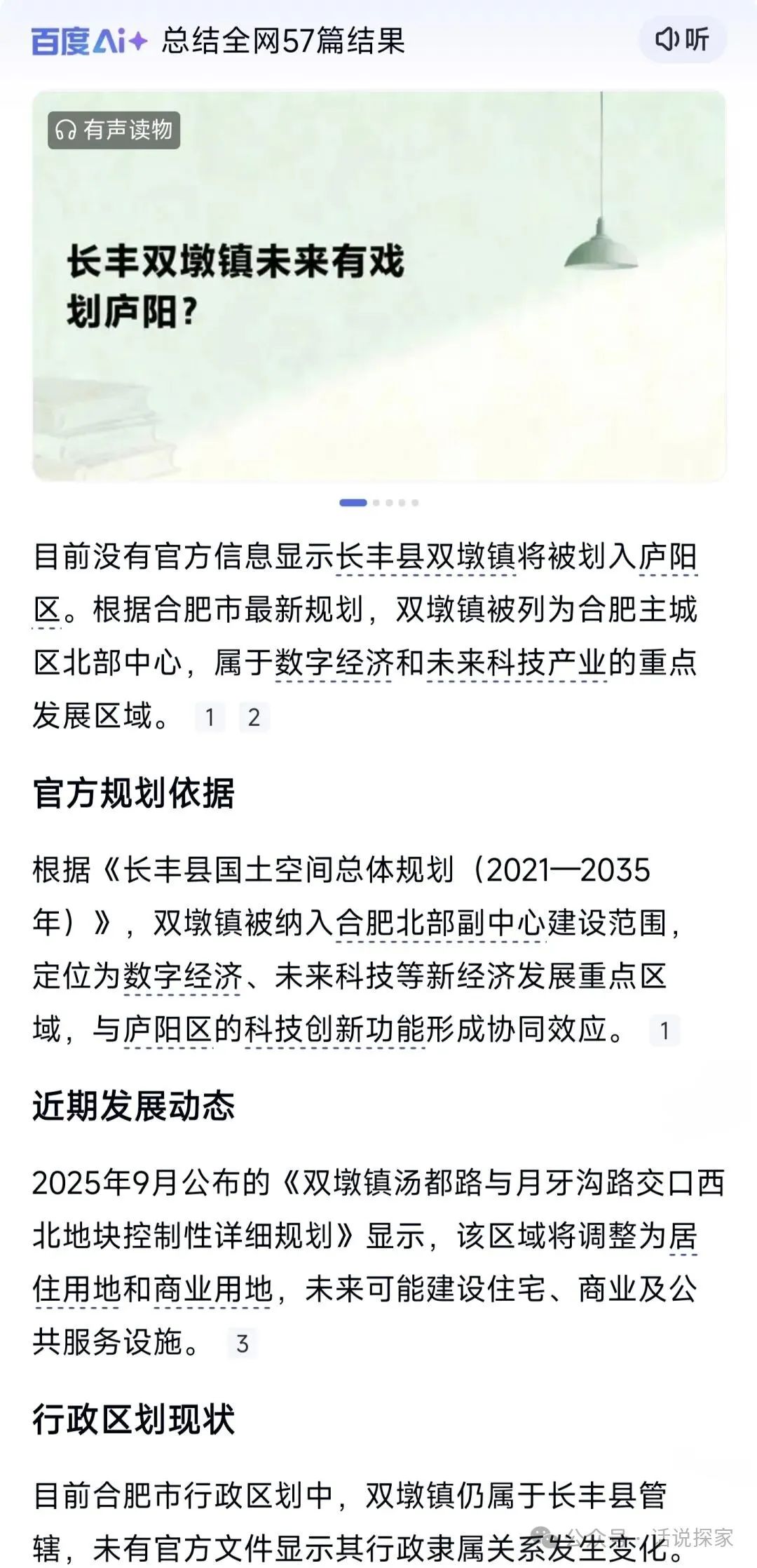 而根据某平台的AI回复,目前没有官方信息显示长丰县双墩镇将被划入庐阳区。