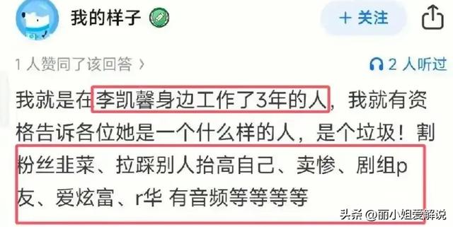 据前助理透露,李凯馨喜欢抬高自己拉踩别人,卖惨又爱炫富,知三当三,甚至辱华等。