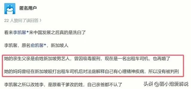李凯馨虽然出生在中国,却是新加坡籍艺人。自诩星二代,其父亲曾经是新加坡艺人,却因为XD被服刑,后来再婚成了出租车司机。