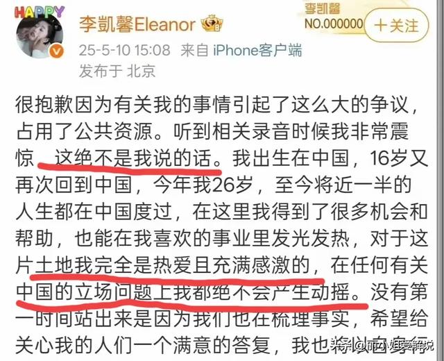 李凯馨本人也发文回应录音里面绝不是她说的话,表示她很爱中国。