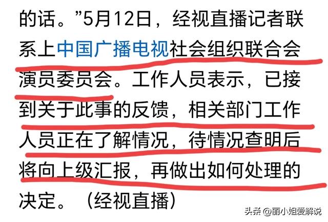 据经视直播报道,中国广播电视社会组织联合会演员委员会表示,已经了解到事情的反馈,待查明后会上报,再决定如何处理。