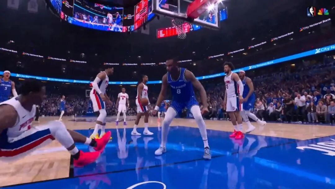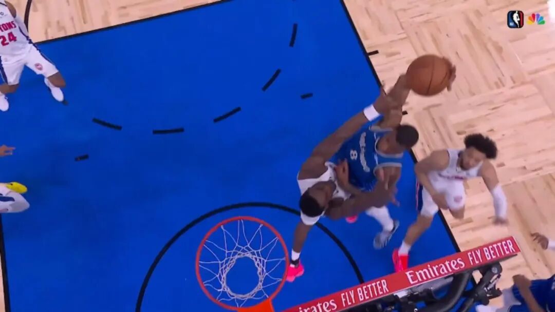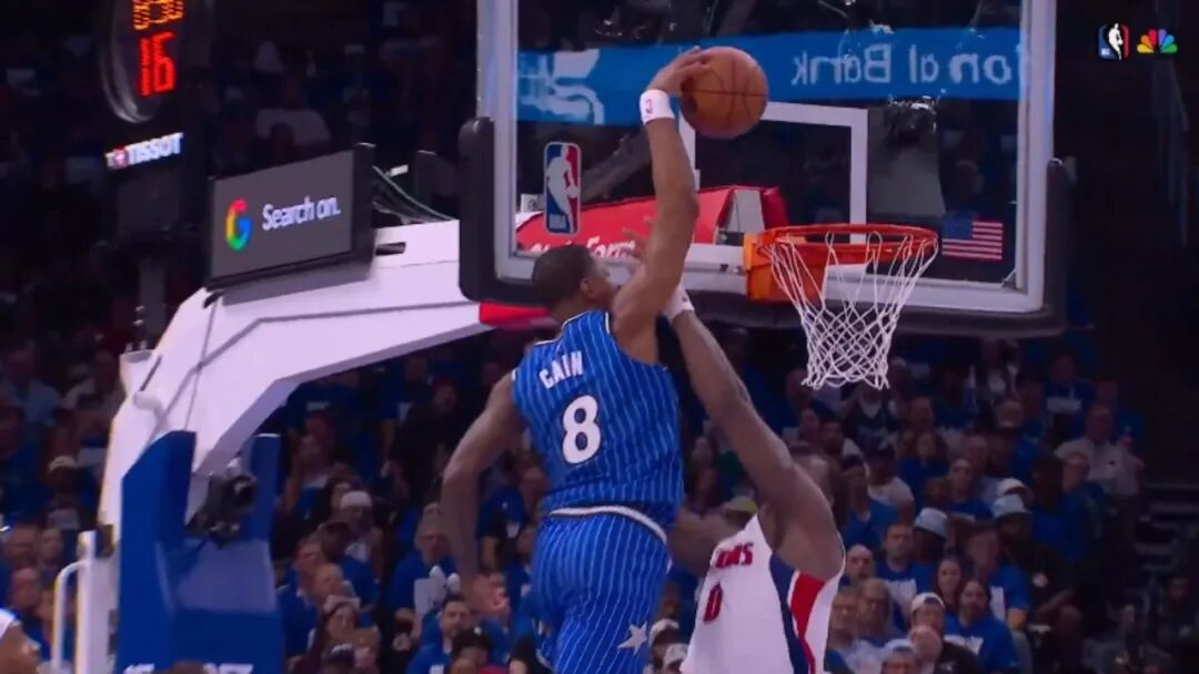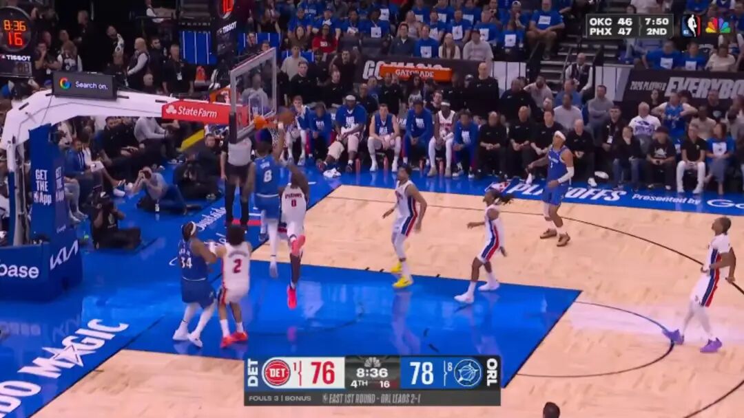 正面对决的一次攻防,卡因直接在杜伦头上完成了一记炸裂隔扣,随后杜伦还摔倒在地——这一球不仅仅是今年季后赛TOP3的隔扣,万一这轮系列赛活塞真的被黑八,未来人们回忆到这轮系列赛,这一球将一次次出现了集锦中。