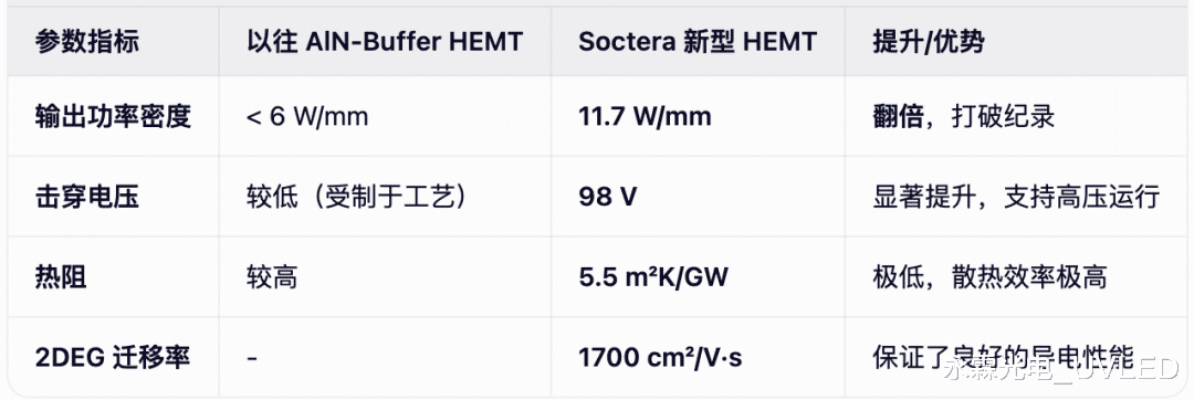 热管理:测量显示,从 2DEG(二维电子气)沟道到 SiC 衬底的热阻仅为5.5 m²K/GW。这大约是传统 1.5 µm 厚 GaN 缓冲层 HEMT 热阻的三分之一。这意味着热量能更快地导出,是实现高功率输出的物理基础。