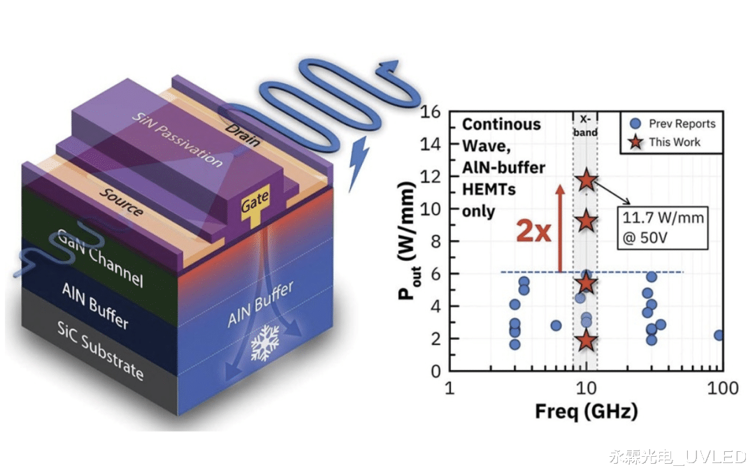 此前,业界普遍认为基于氮化铝(AlN)缓冲层的 HEMT 器件,其连续波(CW)输出功率难以超过6 W/mm。这导致许多人对该技术持怀疑态度,尽管 AlN 拥有极佳的导热性能,但实际输出功率却一直“拉胯”。