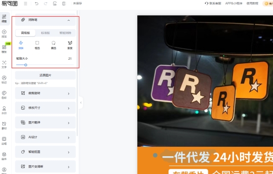 核心功能: 提供“消除笔”(手动)、“智能消除”(AI自动),适用于对图片中的文字、水印、物体、人像或其他不需要的部分进行精确删除。