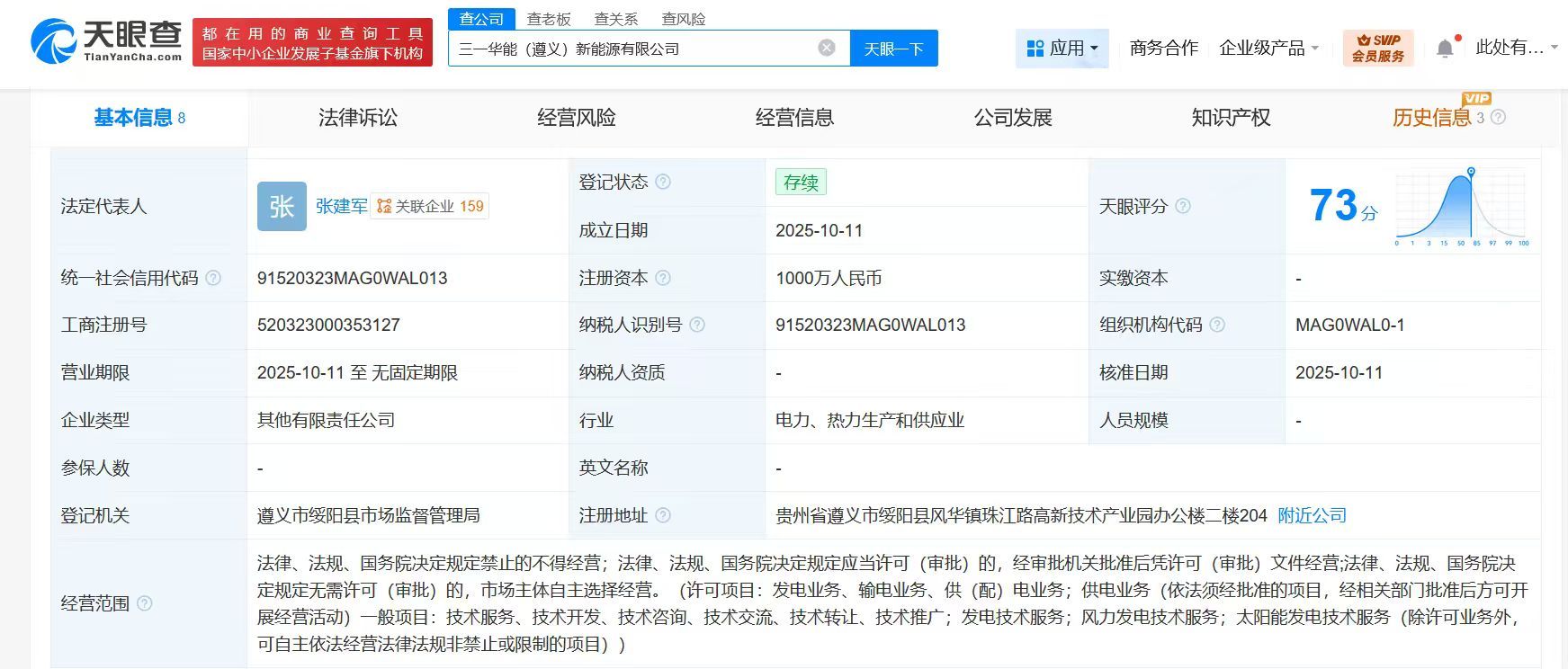 天眼查工商信息显示,近日,三一华能(遵义)新能源有限公司成立,法定代表人为张建军,注册资本1000万人民币,经营范围含发