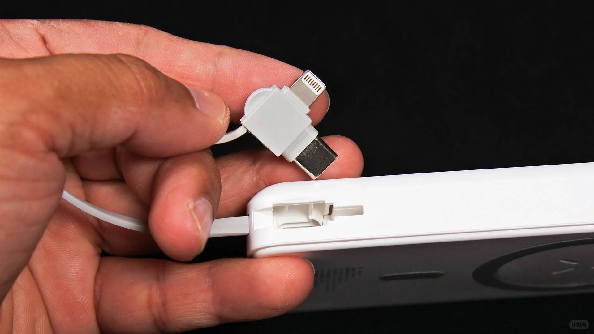 飞利浦这款10000mAh的体量不大,却能覆盖一整天城市通勤,iPhone 17 基本能补两次电。自带 Lightning 与 Type-C 两根线,不用翻包找线,用起来很直观,线收回贴合机身,不会勾到包里的其他东西。支持 22.5W 快充,给 iPhone 和华为手机都能跑到各自可识别的快充状态。