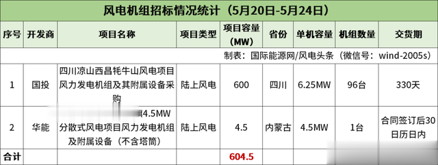 累计604.5MW2家开发商风电机组招标国际能源网/风电头条统计,本周风机招标市场方面,共有2个项目604.5MW风机启动采购,开发商是国投、华能2家。国投招标规模为600MW,华能招标规模为4.5MW。