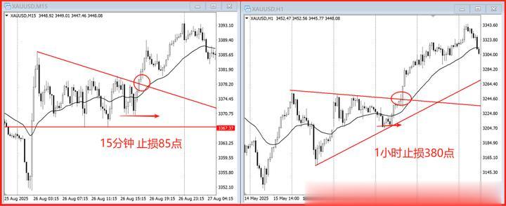 图中是黄金的K线图,左侧15分钟,右侧1小时。