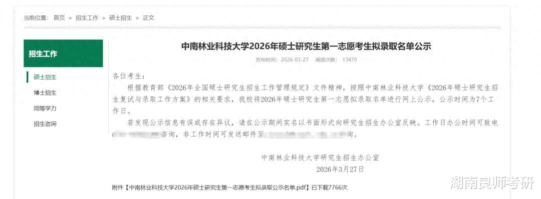 在别的院校还没组织复试的时候,中南林业科技大学在3月27日,就发布了一志愿的拟录取名单的公示,公示时间为7个工作日。
