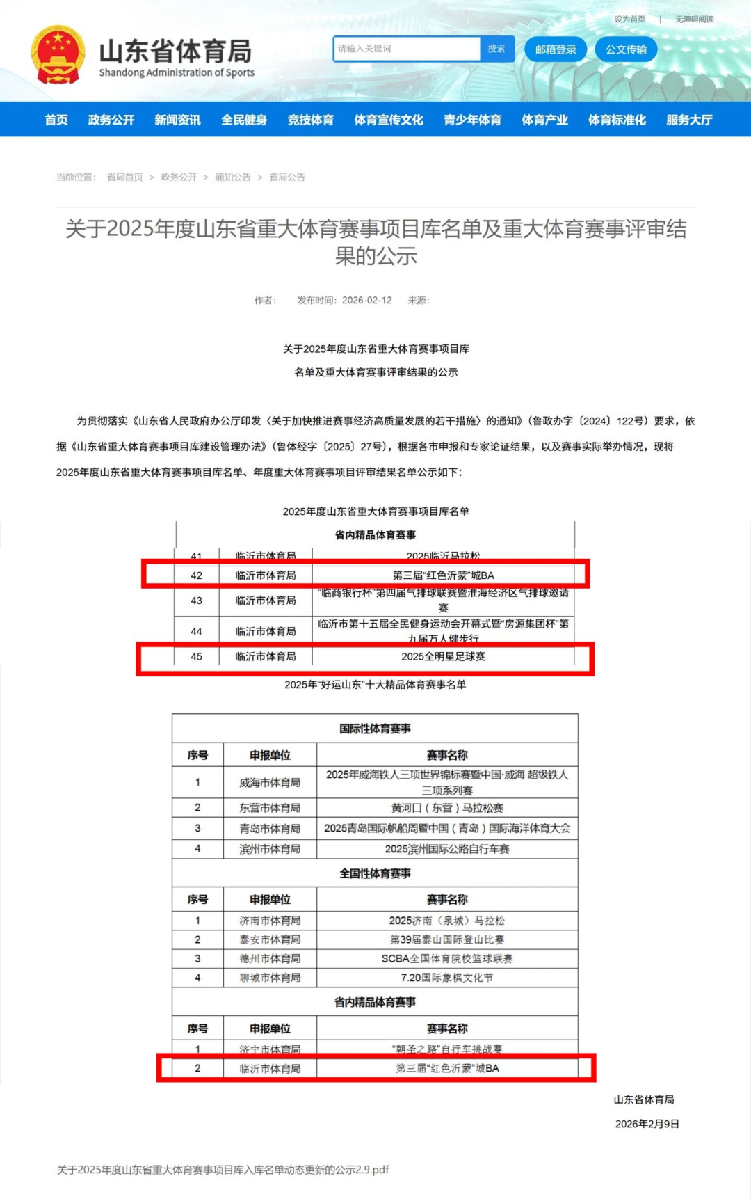 红色沂蒙“城BA”篮球联赛,三年累计传播数据超2.1亿次,2025年第三届赛事曝光量突破1亿次,并于2026年2月荣获“好运山东”十大精品体育赛事,成为临沂群众篮球的闪亮名片。、