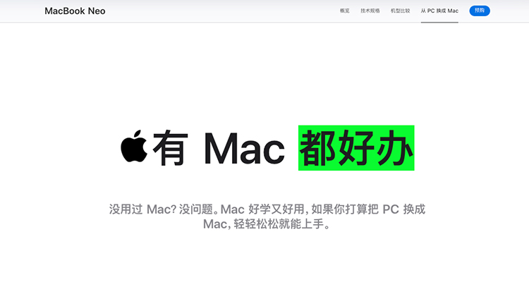 苹果发布了新的笔记本电脑MacBook Neo,这台更加“入门级”的电脑就是此前我们一直在跟进的青春版MacBook。它搭载的不是苹果的M系列处理器,而是iPhone 16 Pro的A18 Pro处理器。说白了,苹果这款青春版电脑性能估计也就那样,但一向自信的苹果居然在MacBook的页面上挂起了“从PC换成Mac”的入口,这一波操作不知道会有多少人愿意入坑。