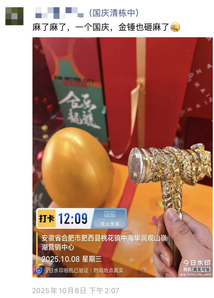 观山嶺湖置业顾问发出感慨,一个国庆,金锤也砸麻了。