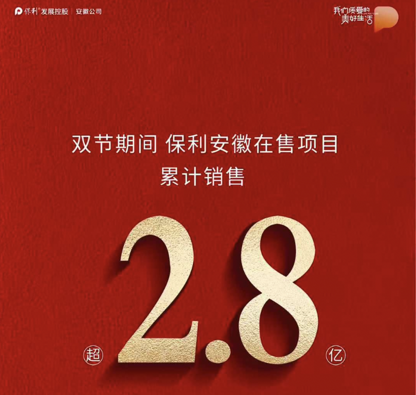 另外,保利发展安徽公司发布海报称:双节期间保利安徽在售项目累计销售超2.8亿元。