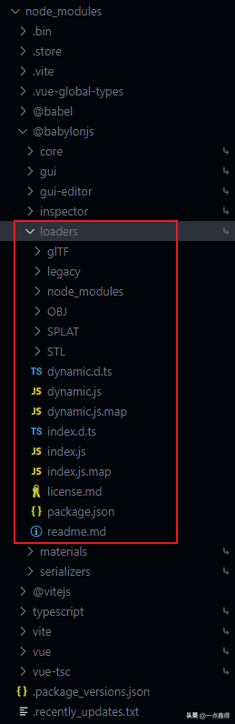 cnpm install @babylonjs/loadersloaders插件安装成功后可以看到其中支持的文件类型,导入这些文件类型前首先需要添加代码import "@babylonjs/loaders"引入插件