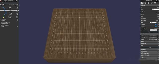 // 导入支持其他文件类型的插件import "@babylonjs/loaders"//... 省略他代码// 在createScene方法添加加载模型代码createScene(): BABYLON.Scene { // Creates a basic Babylon Scene object const scene = new BABYLON.Scene(this.engine); // 显示inspector scene.debugLayer.show() // 隐藏inspector // scene.debugLayer.hide() // 创建摄像机,也就是观察者 // Creates and positions a free camera const camera = new BABYLON.ArcRotateCamera("camera1", -Math.PI / 2, Math.PI / 6, 3.6, BABYLON.Vector3.Zero(), scene) // This attaches the camera to the canvas camera.attachControl(this.canvas, true); // 添加环境光 // Creates a light, aiming 0,1,0 - to the sky const hlight = new BABYLON.HemisphericLight("light", new BABYLON.Vector3(1, 1, 0), scene); // Dim the light a small amount - 0 to 1 hlight.intensity = 0.36; // 加载围棋模型(仅显示棋盘),第一个参数为空表示加载所有的模型 BABYLON.SceneLoader.ImportMeshAsync("", "./", "go.glb").then((result) => { console.log(result) const table = this.scene.getMeshByName("table"); table.position.y = 0.44; table.position.x = 0; table.position.z = 0; table.rotate(BABYLON.Axis.Y, Math.PI, BABYLON.Space.LOCAL); // 不显示黑白棋子 const white = this.scene.getMeshByName("white") const black = this.scene.getMeshByName("black") if (white) { white.setEnabled(false) } if (black) { black.setEnabled(false) } }) return scene;}运行cnpm run dev启动开发web服务,随时可以查看显示效果,可以启用Babylon.js提供inspector查看模型部件,和blender显示的部件是差不多的。