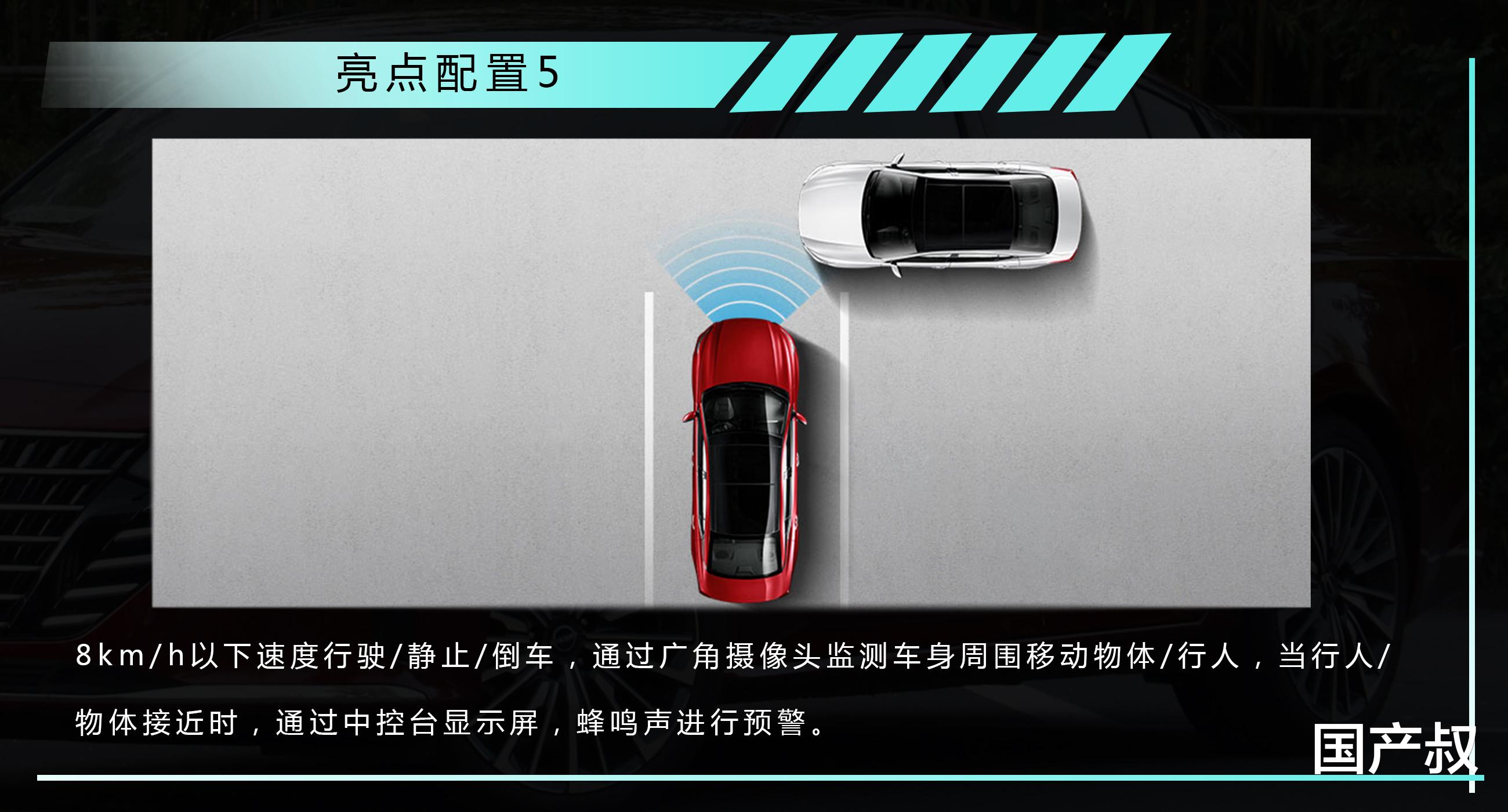 MOD移动物体/行人预警:8km/h以下速度行驶/静止/倒车,通过广角摄像头监测车身周围移动物体/行人,当行人/物体接近时,通过中控台显示屏,蜂鸣声进行预警。