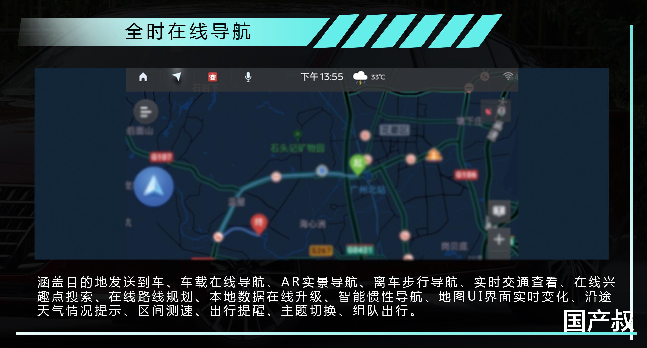 涵盖目的地发送到车、车载在线导航、AR实景导航、离车步行导航、实时交通查看、在线兴趣点搜索、在线路线规划、本地数据在线升级、智能惯性导航、地图UI界面实时变化、沿途天气情况提示、区间测速、出行提醒、主题切换、组队出行。