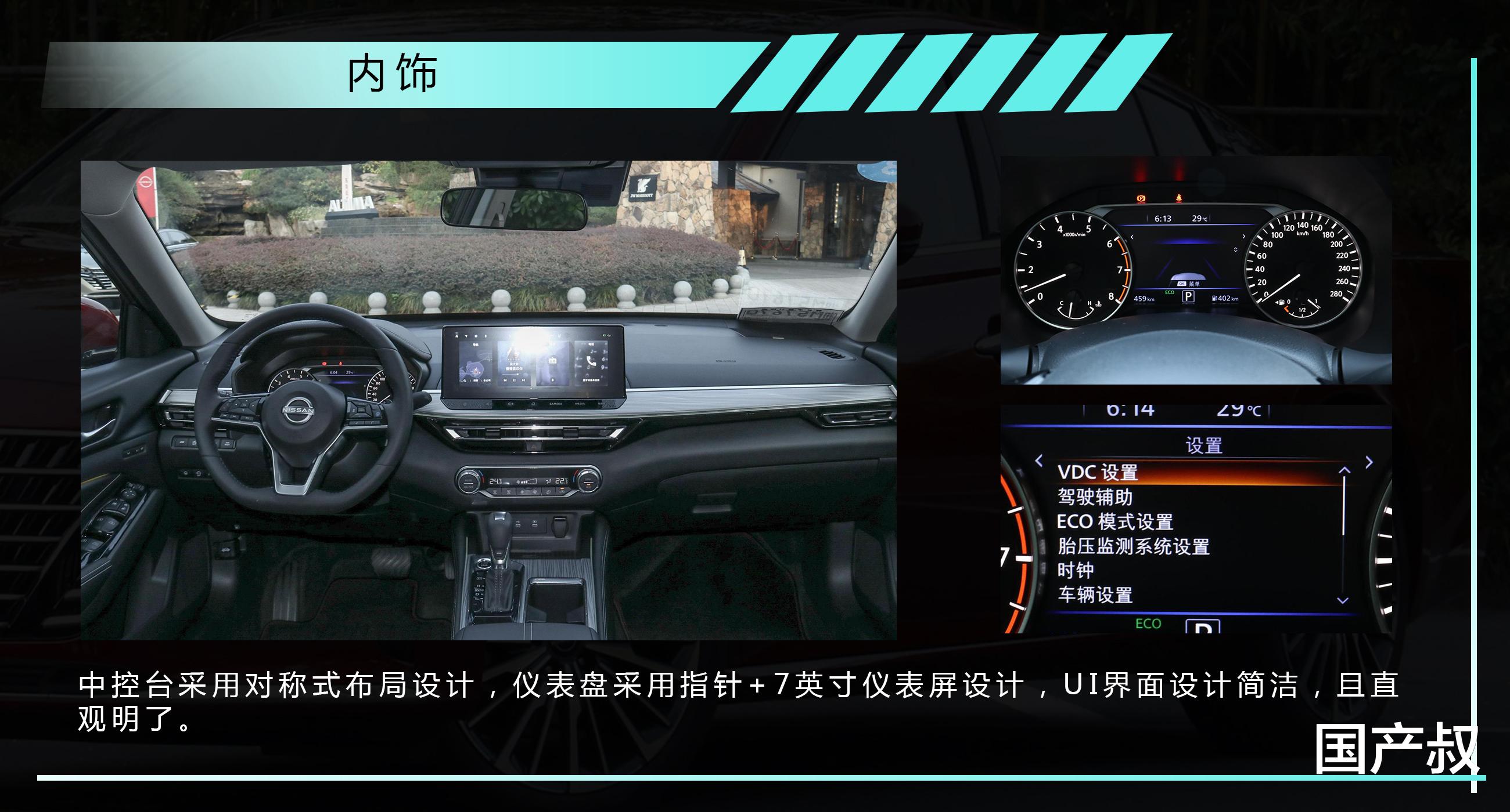 进入车内,中控台采用对称式布局设计,仪表盘采用指针+7英寸仪表屏设计,UI界面设计简洁,且直观明了。