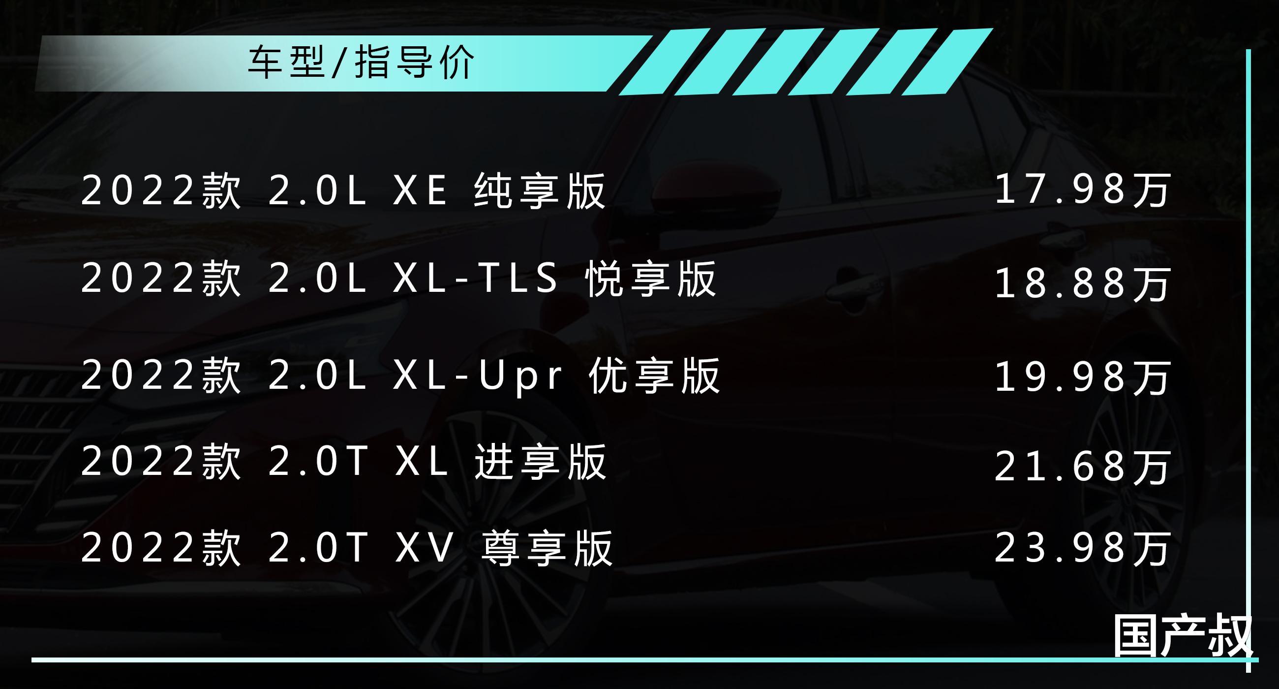 日产天籁在中型车市场中的关注度比较高,与同级竞品车型丰田凯美瑞、本田雅阁、大众帕萨特等形成比较高的影响力。全新天籁作为东风汽车旗下的“主力军”,承担品牌销量任务的同时,也塑造了高端品牌的形象。选择它的用户群体多聚集于事业进取、享受生活、处于人生进阶期的人群,恰好与全新天籁这款车相契合。目前共推出五款不同配置车型,包括纯享版、悦享版、优享版、进享版和尊享版,指导价区间为17.98-23.98万元,前三款为2.0L版本,后两款为2.0T版本,接下来跟我一起全面了解一下,2.0T版本全新天籁的产品力表现及优势。