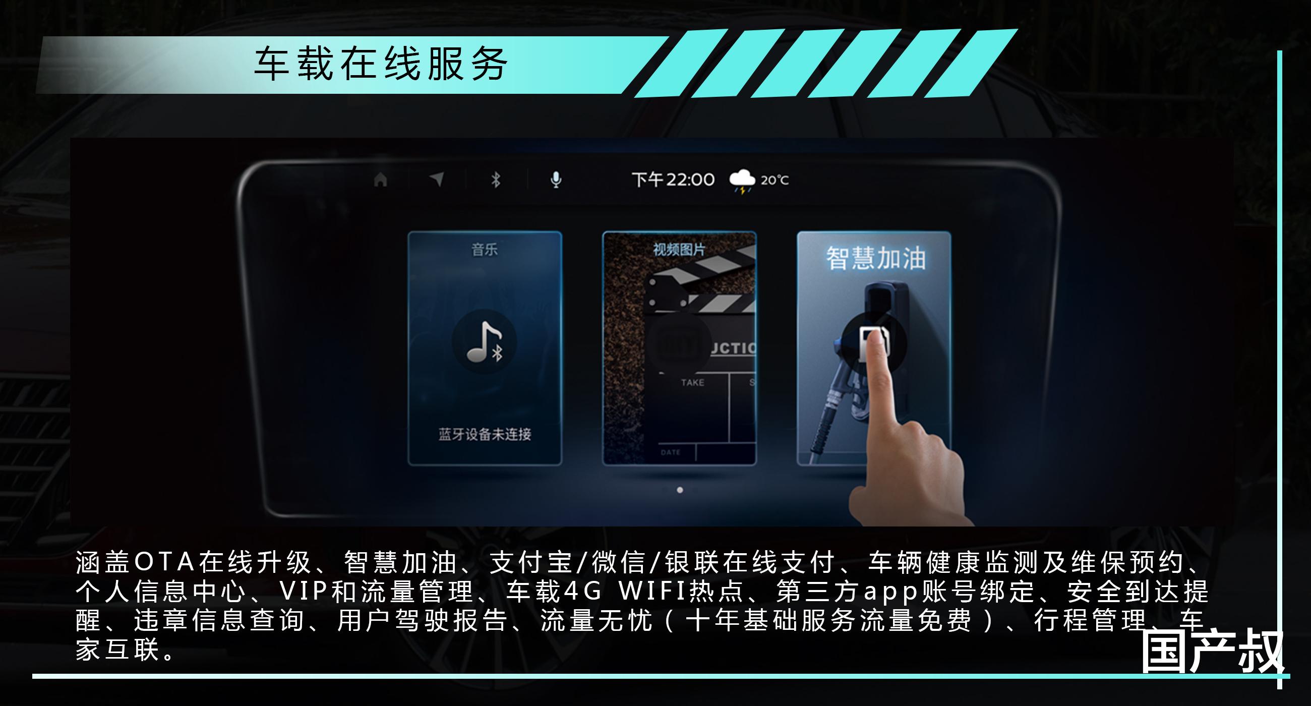 涵盖OTA在线升级、智慧加油、支付宝/微信/银联在线支付、车辆健康监测及维保预约、个人信息中心、VIP和流量管理、车载4G WIFI热点、第三方app账号绑定、安全到达提醒、违章信息查询、用户驾驶报告、流量无忧(十年基础服务流量免费)、行程管理、车家互联。