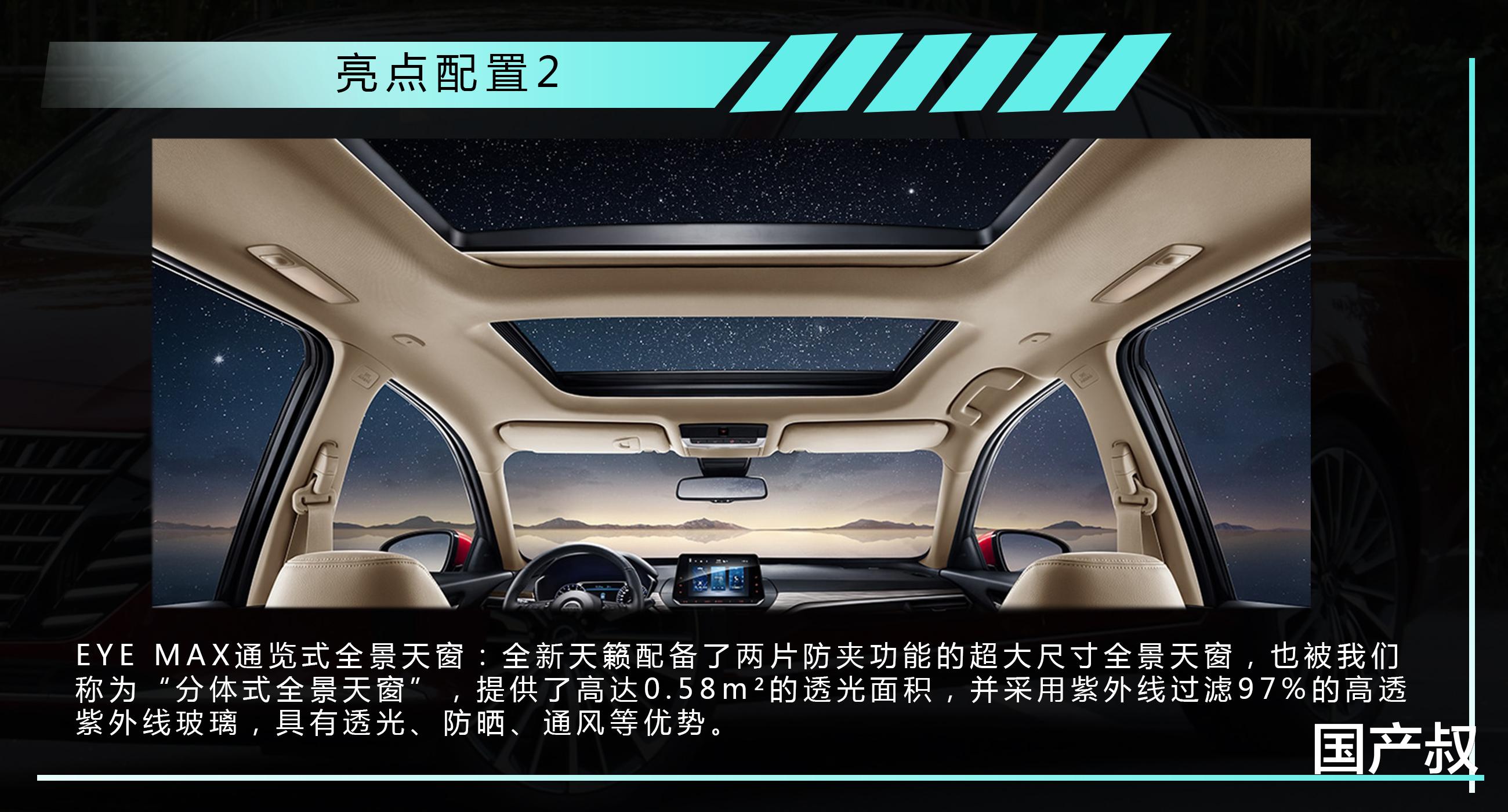 EYE MAX通览式全景天窗:全新天籁配备了两片防夹功能的超大尺寸全景天窗,也被我们称为“分体式全景天窗”,提供了高达0.58m²的透光面积,并采用紫外线过滤97%的高透紫外线玻璃,具有透光、防晒、通风等优势。
