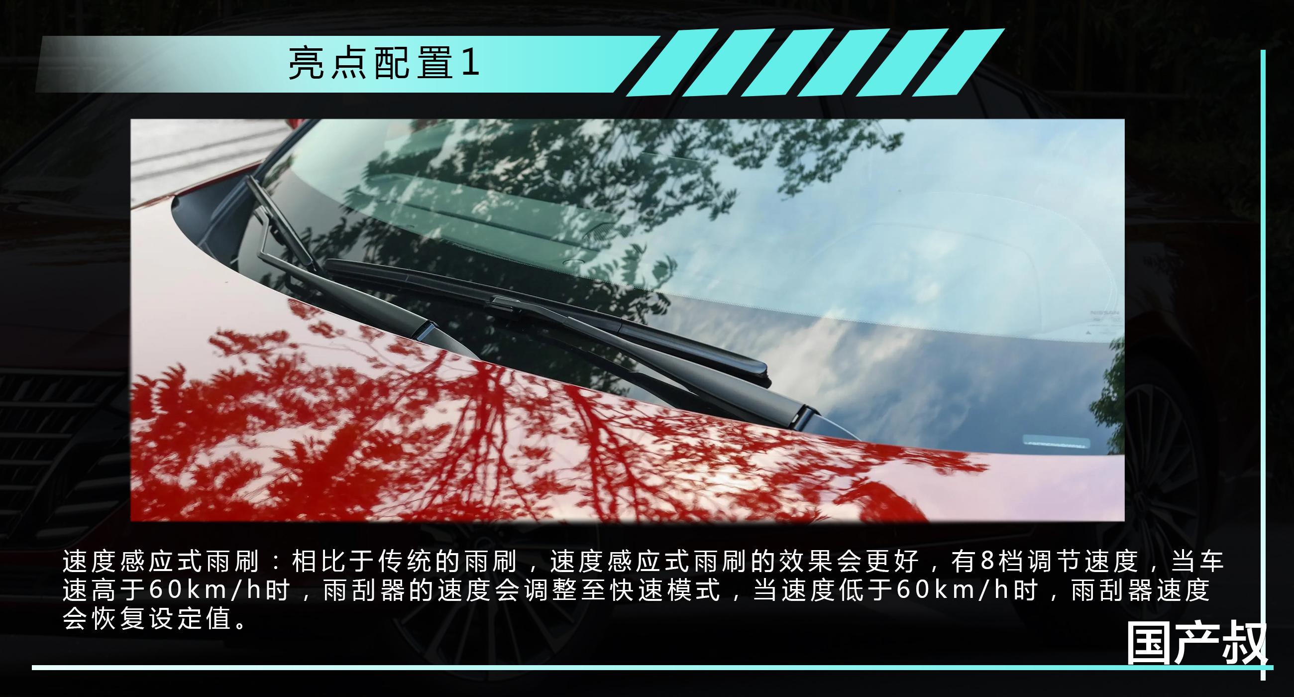 速度感应式雨刷:相比于传统的雨刷,速度感应式雨刷的效果会更好,有8档调节速度,当车速高于60km/h时,雨刮器的速度会调整至快速模式,当速度低于60km/h时,雨刮器速度会恢复设定值。