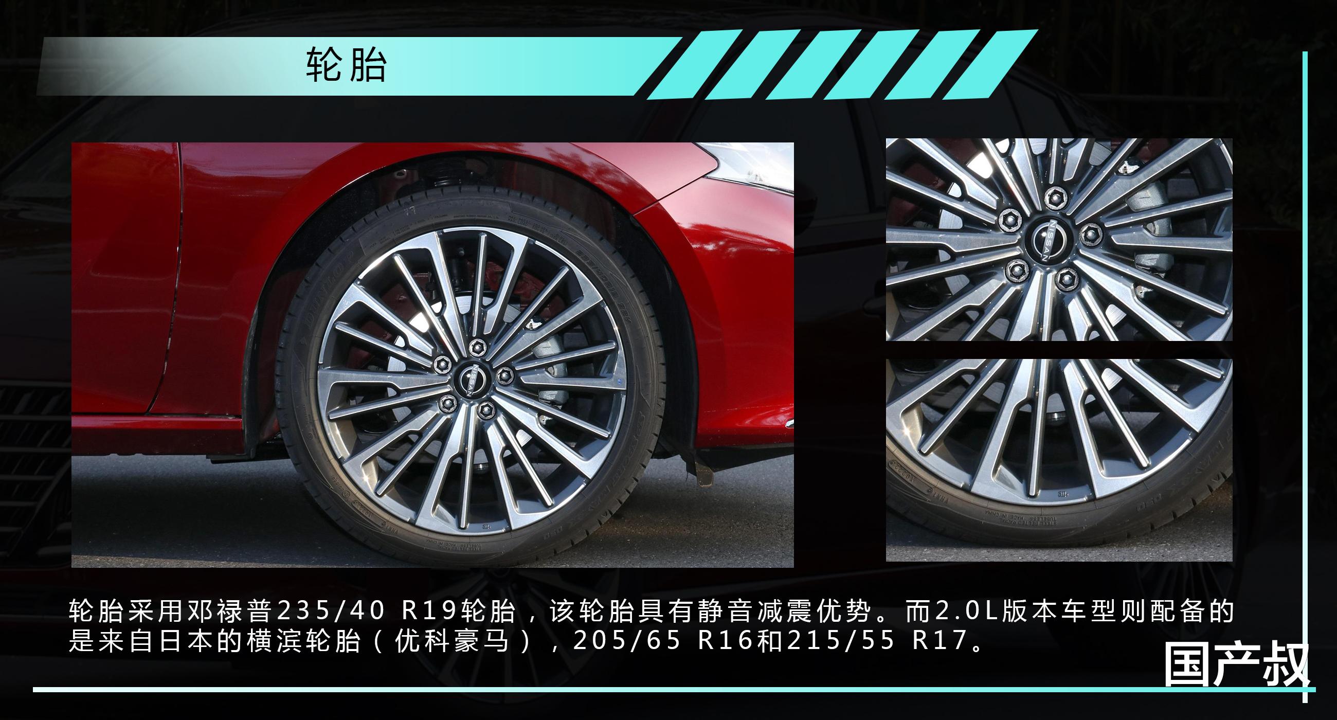 轮胎采用邓禄普235/40 R19轮胎,该轮胎具有静音减震优势。而2.0L版本车型则配备的是来自日本的横滨轮胎(优科豪马),205/65 R16和215/55 R17。