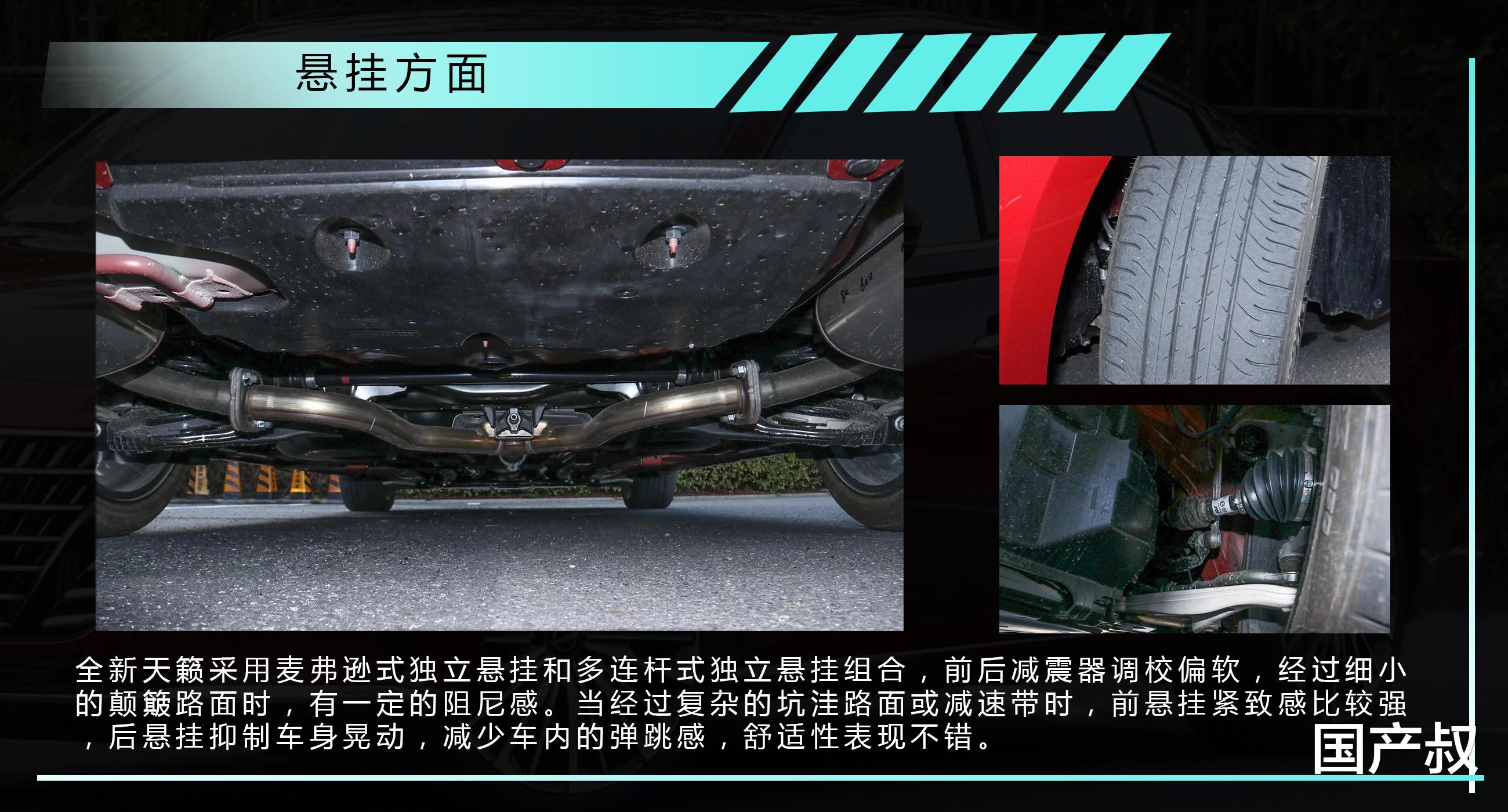 全新天籁采用麦弗逊式独立悬挂和多连杆式独立悬挂组合,前后减震器调校偏软,经过细小的颠簸路面时,有一定的阻尼感。当经过复杂的坑洼路面或减速带时,前悬挂紧致感比较强,后悬挂抑制车身晃动,减少车内的弹跳感,舒适性表现不错。