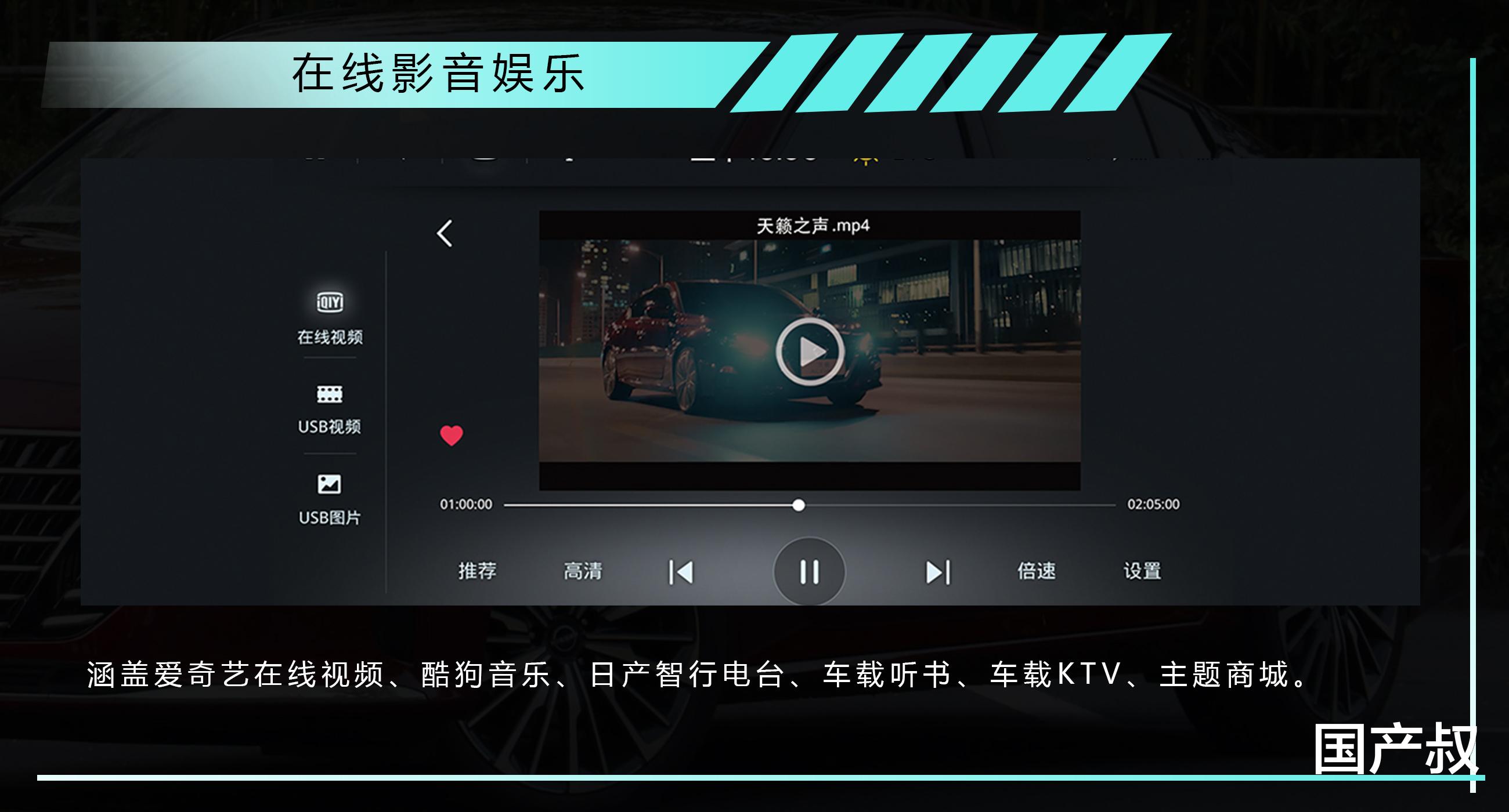 涵盖爱奇艺在线视频、酷狗音乐、日产智行电台、车载听书、车载KTV、主题商城。