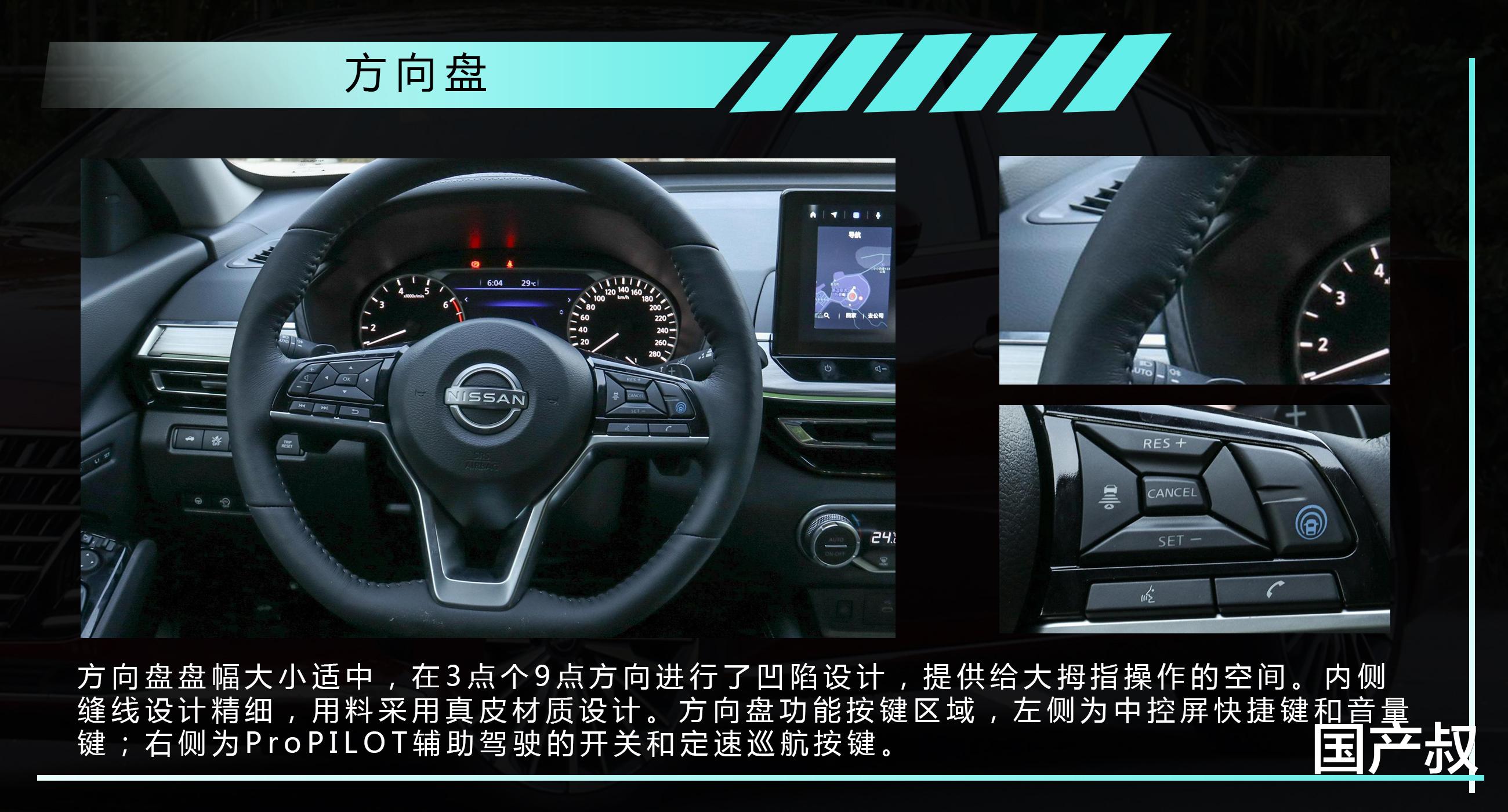 方向盘盘幅大小适中,在3点个9点方向进行了凹陷设计,提供给大拇指操作的空间。内侧缝线设计精细,用料采用真皮材质设计,触摸起来舒适柔软,支持上下+前后调节,顶配车型支持拨片换挡和方向盘加热功能。此外,方向盘功能按键区域,左侧为中控屏快捷键和音量键;右侧为ProPILOT辅助驾驶的开关和定速巡航按键。