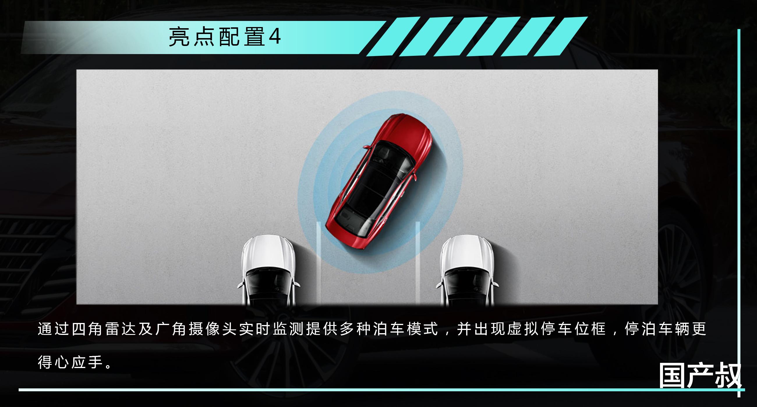 IPA智能泊车辅助:通过四角雷达及广角摄像头实时监测提供多种泊车模式,并出现虚拟停车位框,停泊车辆更得心应手。